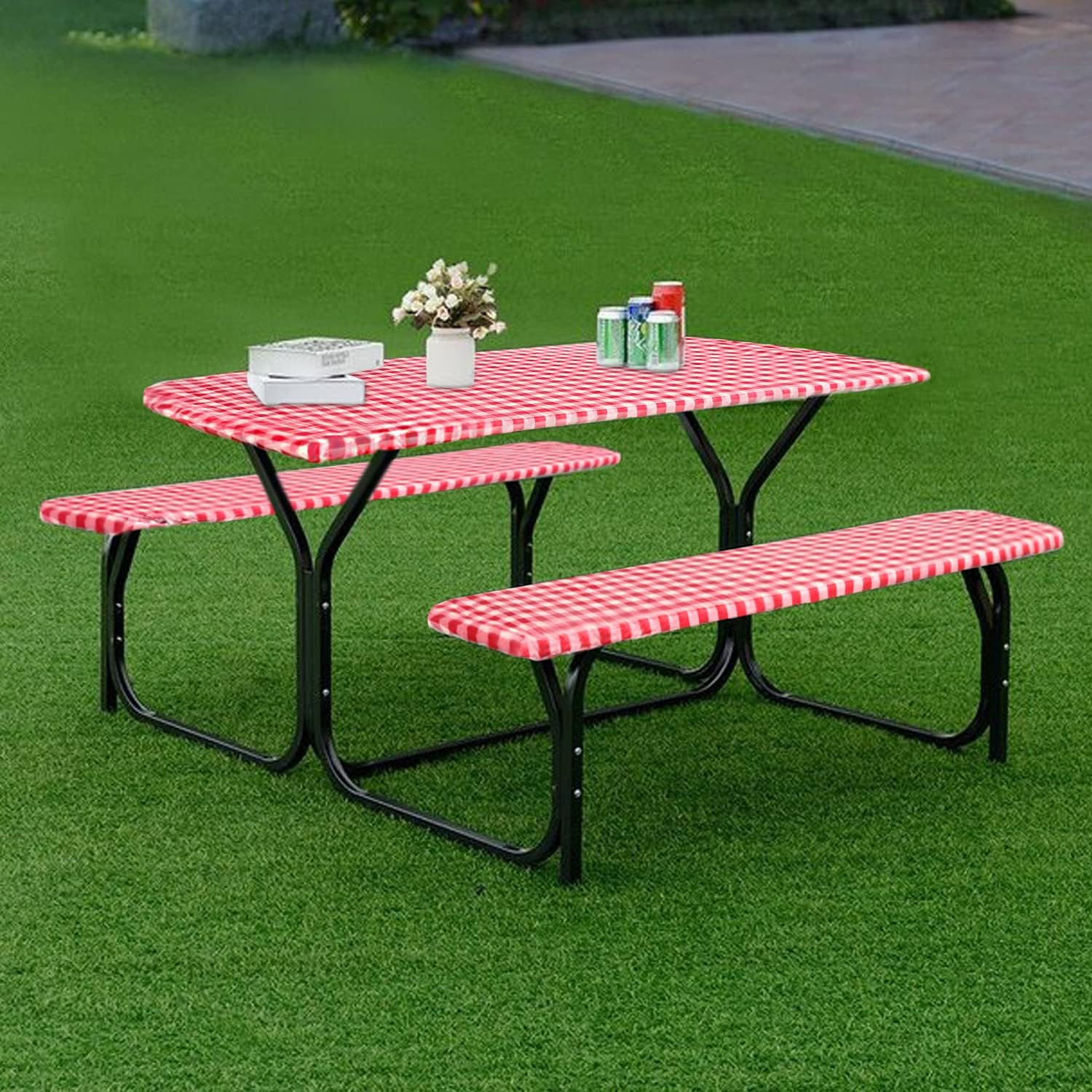 Red And White Grid Outdoor Dining Table And Chair Cover